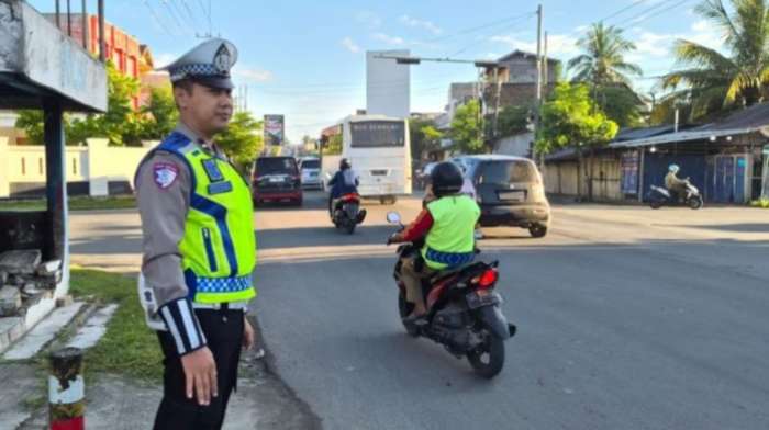Selain pengaturan lalu lintas, personel juga melakukan peneguran humanis kepada pengendara yang tidak menggunakan helm berstandar SNI dan mengarahkan masyarakat untuk lebih tertib dalam berlalu lintas.