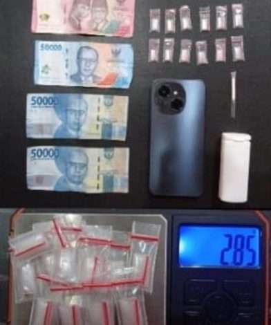 Barang bukti yang diamankan antara lain 12 bungkus plastik klip bening, yang masing-masing berisi kembali 12 bungkus plastik klip bening berisikan kristal-kristal bening diduga sabu dengan berat bruto 2,85 gram. Selain itu, turut diamankan 1 unit handphone merk Tecno Spark warna biru, uang tunai sebesar Rp250.000, dengan rincian 3 lembar pecahan Rp50.000 dan 1 lembar pecahan Rp100.000, 1 buah pipet yang ujungnya diruncingkan (sekop), 1 buah kotak permen merk Happydent warna putih, serta 1 buah celana pendek warna abu-abu tanpa merk.