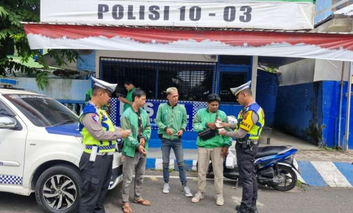 Satgas Kamseltibcar Lantas Ops Lilin Musi 2025 melaksanakan kegiatan menyapa pengemudi ojek online di Lokasi Jalan Jend A.yani Depan Pos 10.03 kel Baturaja Lama Kec. Baturaja Timur. Minggu 21/12/2025.